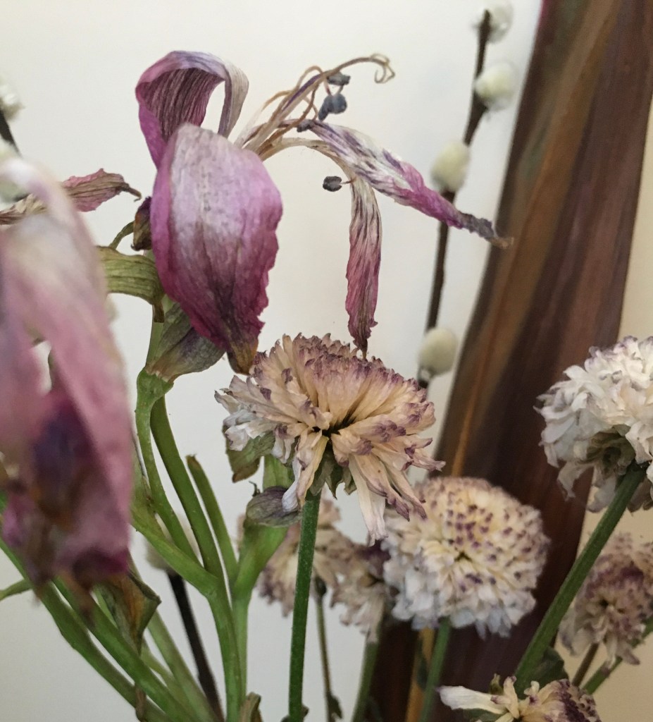 Nearly a month ago, I picked up a gorgeous bouquet and placed it on the top of the piano, my favourite spot for a vase full of bright blooms. Its longevity was surprising! Beautiful purple and white flowers brightened the room day after day. Slowly, as they are prone to do, they began to wilt and drop their petals. I thinned out the bunch and placed it back in its spot, hoping for a few more days of spring beauty indoors while I await its arrival outside.